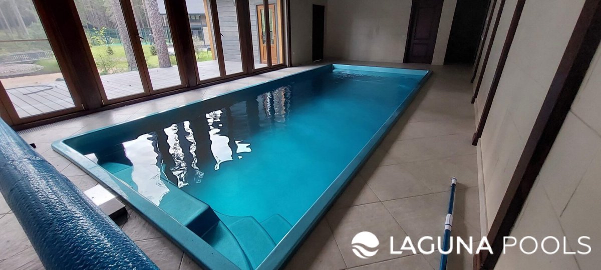 Прямоугольный композитный бассейн с ярко-голубой чашей расположен в помещении с панорамными окнами и светло-серым плиточным полом.