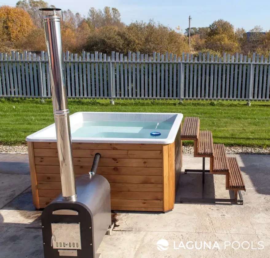 Уличная квадратная купель с дровяной печью на фоне металлического забора